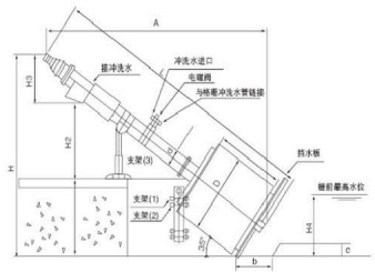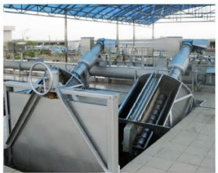工作原理:轉鼓式格柵除污機與水平面呈35°安裝在水渠中,污水從鼓的端頭流入鼓中,水通過柵網的柵縫流出,固體垃圾被過濾在柵網筐內,帶有耙齒的清潔臂在圓周運動時清理格柵縫隙,耙齒伸入柵網中,將固體取出,當清潔臂處于最高點時,通過水的沖洗及擋渣板的作用,將垃圾從耙齒上清除下來,并掉入垃圾收集裝置螺旋輸送斗中,在輸送過程中通過變螺距的作用被脫水,在最上端壓縮區(qū)被擠干,而擠壓水被回流至水渠,垃圾最后送入集裝箱或后繼設備,再進行處理。